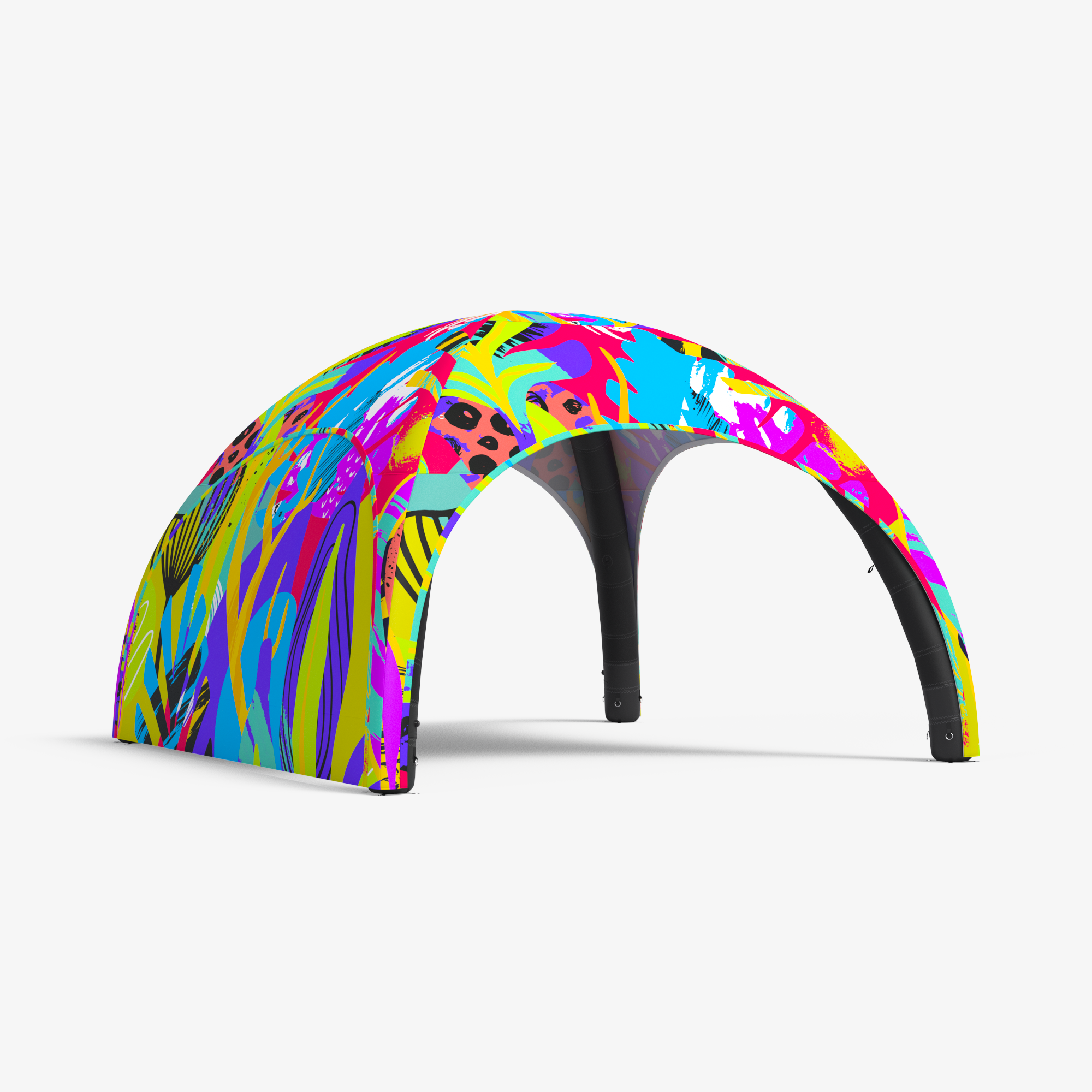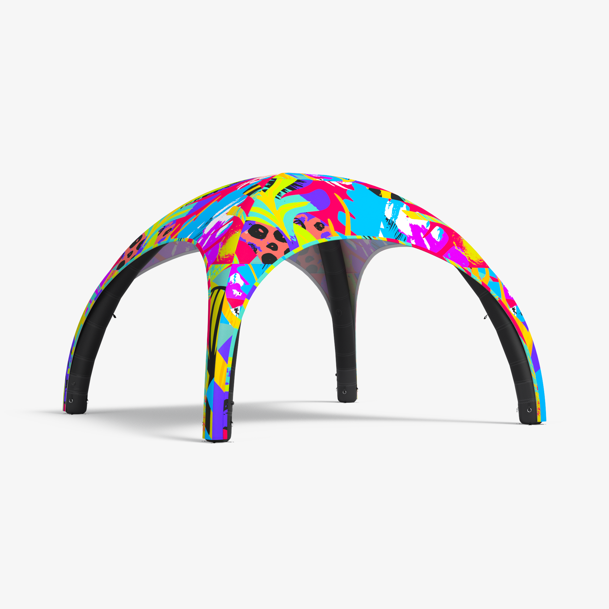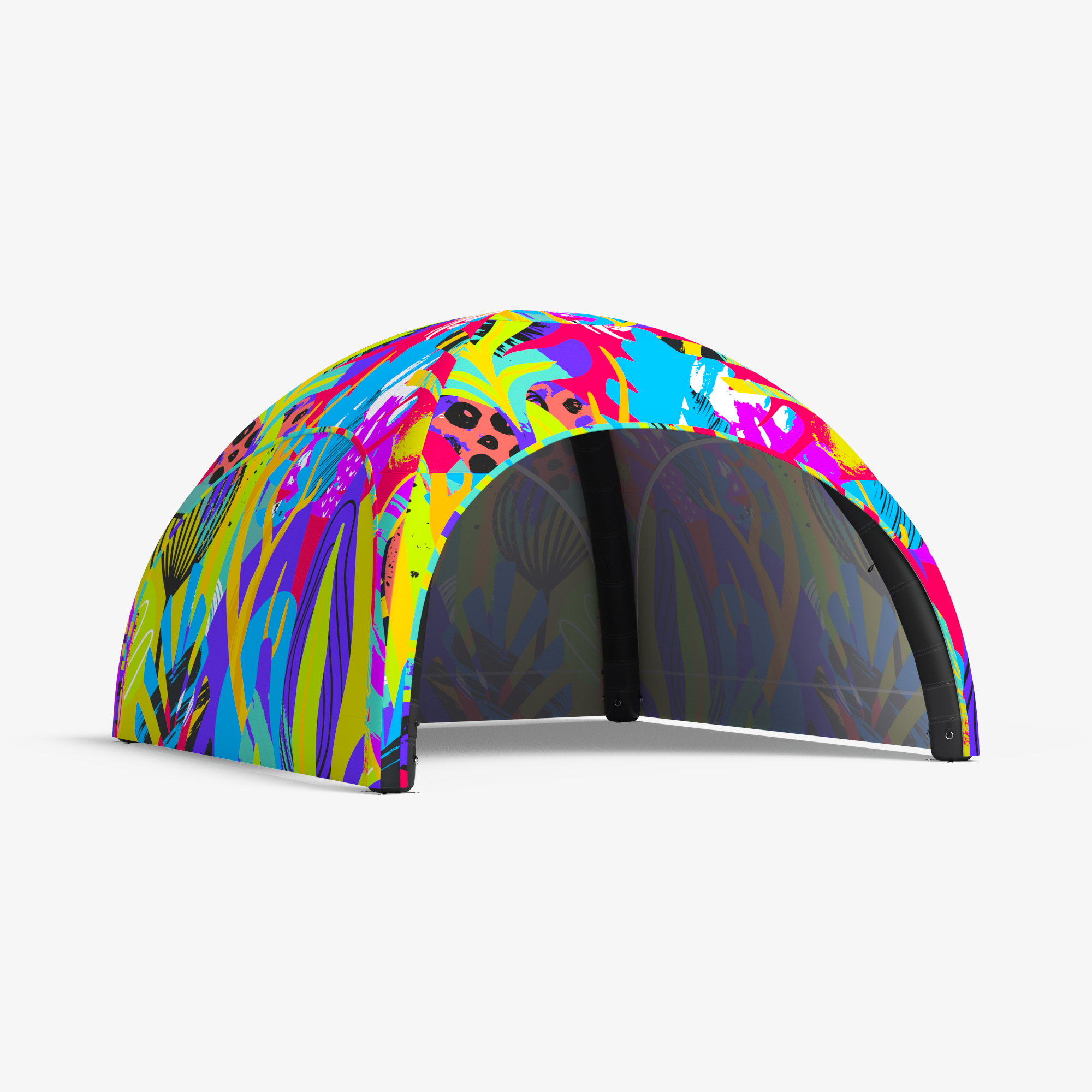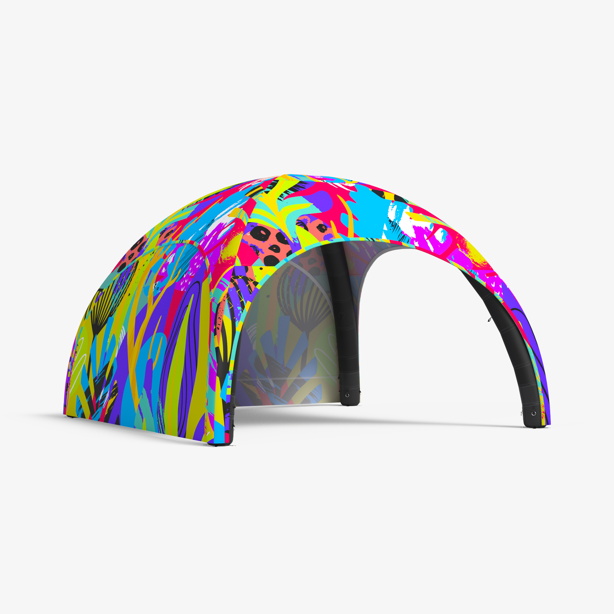 Ventilsystemet skyddar strukturen från överuppblåsning, medan de grå luftfördelningsrören högst upp i tältet säkerställer jämn fyllning. Systemet upprätthåller ett konstant tryck i konstruktionen och blåser upp den automatiskt vid behov. Allt detta är dolt under en elegant design.