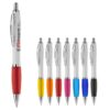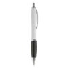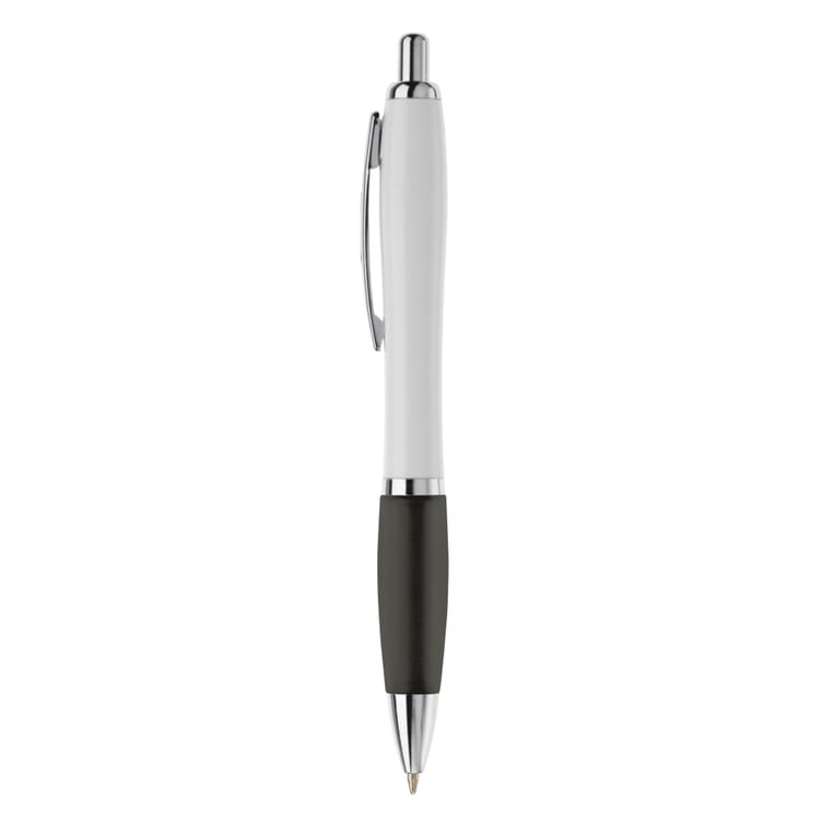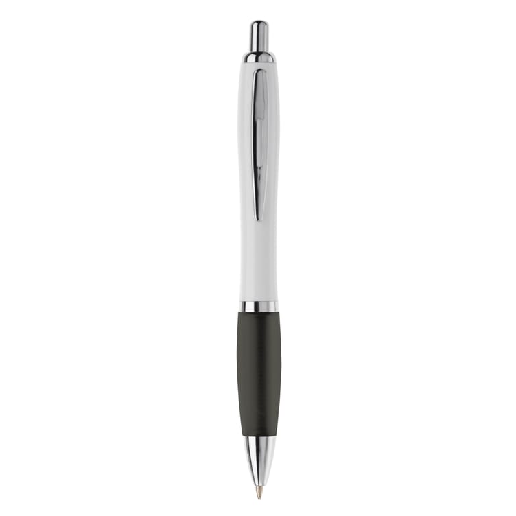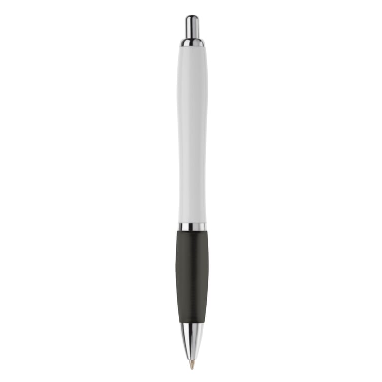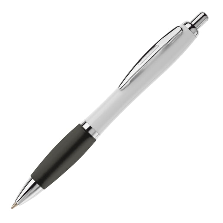 Kulspetspenna, vit med blanka silverfärgade detaljer och färgat grepp. Blått bläck.