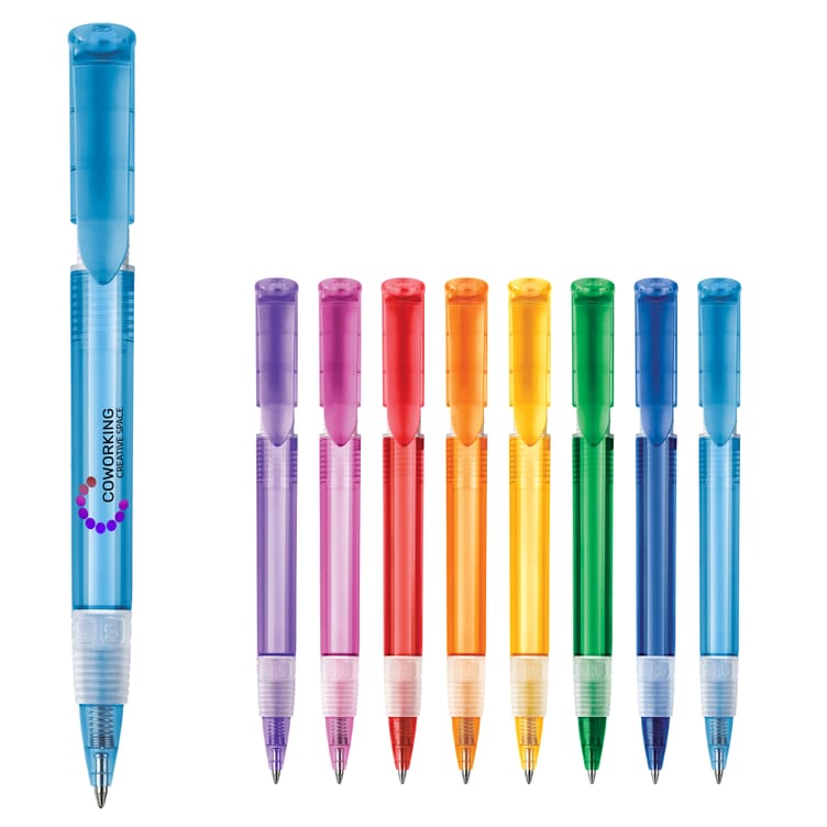S40 Grip Clear transparent har ett snyggt färgat clips, perfekt att placera sin logga på. Pennan har ett gummigrepp i samma färg som clipset. Tillverkad i Europa av av ABS-plast och har en påfyllningsbar Toppoint jumbo patron med blått bläck. Från 5000st kan du välja din egen färgkombination.